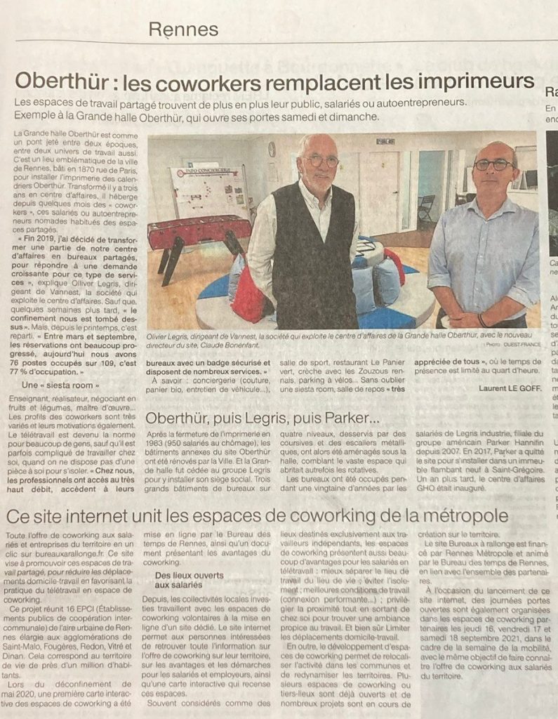 Un bel article dans le Ouest France du jour sur notre espace de coworking/bureaux partagés « l’Avenir at GHO » au sein de la Grande Halle Oberthur.